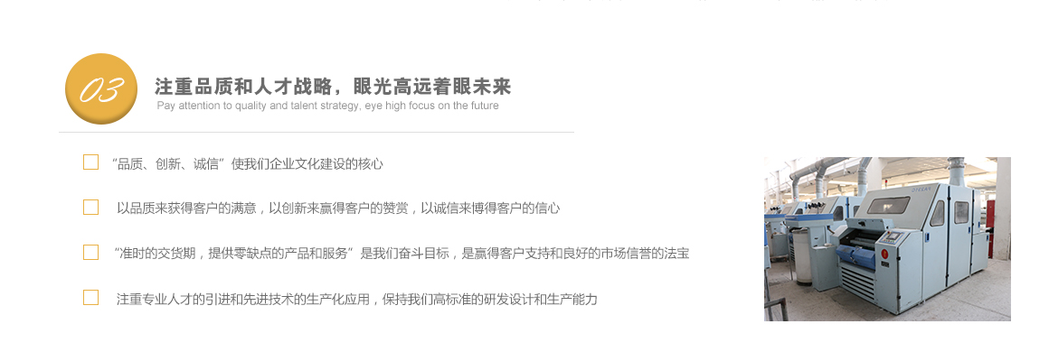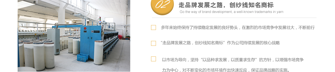 太倉市高陽工貿(mào)有限公司是專業(yè)從事特種紗生產(chǎn)十?dāng)?shù)年的一線生產(chǎn)廠家,坐落于江蘇省蘇州市太倉市雙鳳鎮(zhèn)新湖建湖路29號(hào),太倉隸屬長(zhǎng)江三角洲經(jīng)濟(jì)圈,交通便捷,經(jīng)濟(jì)發(fā)達(dá),是著名的紡織生產(chǎn)基地。 公司歷史要追溯到1982年就成立的新湖毛紡織廠。1996年,毛紡織廠與上海二十二棉在新湖聯(lián)合組建了太倉市新湖福利綜合廠。2002年為適應(yīng)市場(chǎng)的飛速變化,公司轉(zhuǎn)制重組更名為太倉市高陽工貿(mào)有限公司。同時(shí)公司適時(shí)調(diào)整生產(chǎn)經(jīng)營策略,調(diào)整產(chǎn)品品種結(jié)構(gòu),把生產(chǎn)特種紗作為主要發(fā)展方向,純棉、滌綸竹節(jié)紗是我們的主要產(chǎn)品。 公司多年來始終保持了持續(xù)穩(wěn)定發(fā)展的良好勢(shì)頭,在激烈的市場(chǎng)競(jìng)爭(zhēng)中發(fā)展壯大,不斷前行。我們把“走品牌發(fā)展之路,創(chuàng)紗線知名商標(biāo)”作為公司持續(xù)發(fā)展的核心戰(zhàn)略。以市場(chǎng)為導(dǎo)向,堅(jiān)持“以品種求發(fā)展,以質(zhì)量求生存”的方針,以增強(qiáng)市場(chǎng)競(jìng)爭(zhēng)力為中心,對(duì)不斷變化的市場(chǎng)環(huán)境作出快速反應(yīng),品牌戰(zhàn)略的實(shí)施。公司注重專業(yè)人才的引進(jìn)和先進(jìn)技術(shù)的生產(chǎn)化應(yīng)用,具備較強(qiáng)的研發(fā)設(shè)計(jì)和生產(chǎn)能力。 公司一直把“品質(zhì)、創(chuàng)新、誠信”作為企業(yè)文化建設(shè)的核心。以品質(zhì)來獲得客戶的滿意,以創(chuàng)新來贏得客戶的贊賞,以誠信來博得客戶的信心。我們把“準(zhǔn)時(shí)的交貨期,提供零缺點(diǎn)的產(chǎn)品和服務(wù)”作為奮斗目標(biāo),贏得了客戶的支持和良好的市場(chǎng)信譽(yù)。 高陽工貿(mào)有限公司愿與廣大客戶加強(qiáng)合作,共享信息,迎接挑戰(zhàn),共同發(fā)展。客戶需求。了解詳細(xì)>>